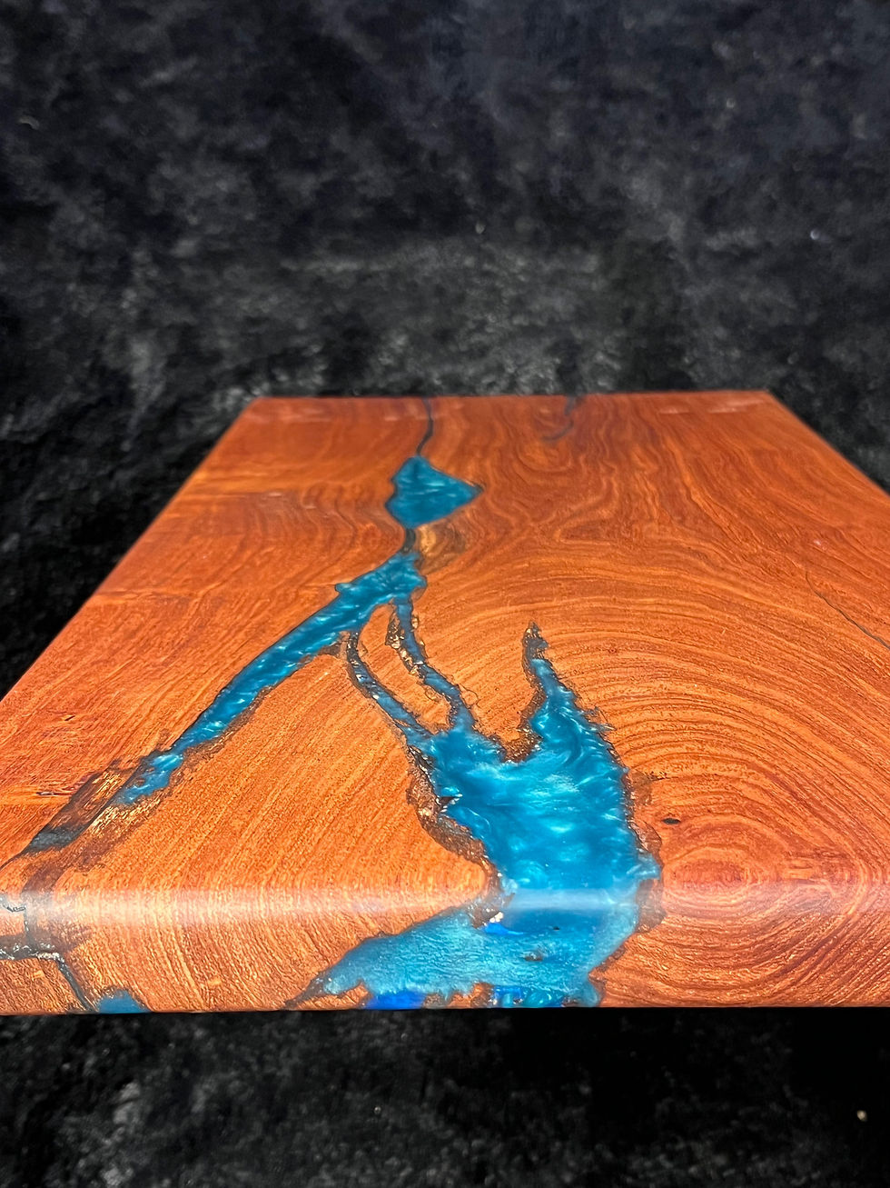 Mesquite Slab Behind Couch Table With Blue Glass Inlay